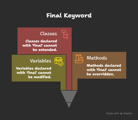 Final Keyword: Modifier preventing modification.