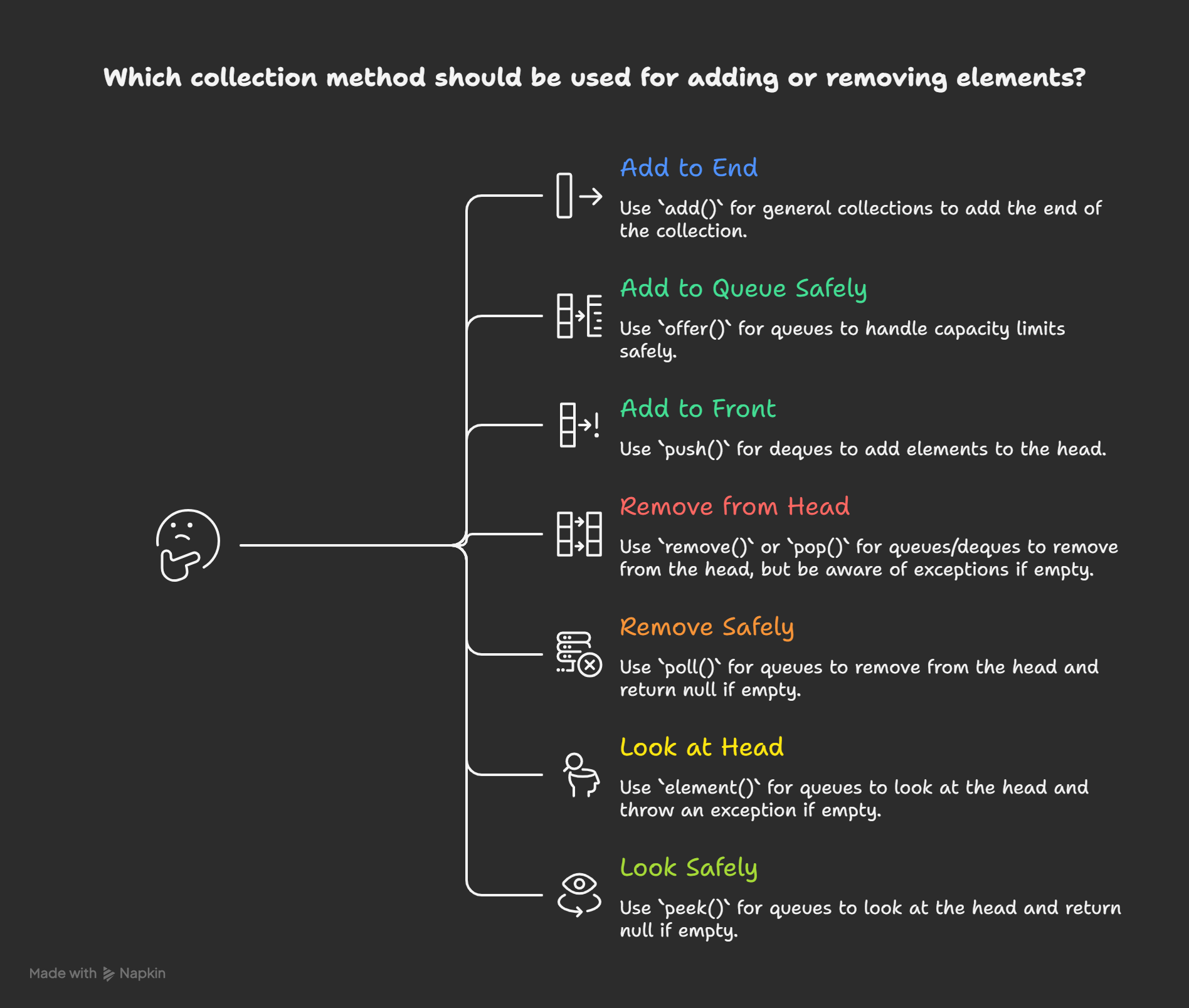 add(e) | Collection | Adds to end (Tail) | Throws Exception (if capacity restricted) |