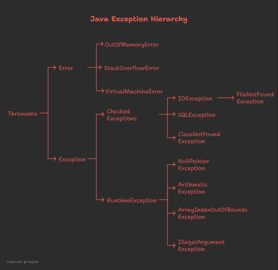 - Exception Hierarchy: Throwable is root, with two branches: Error (system errors) and Exception (application errors). RuntimeException is unchecked; others are checked.